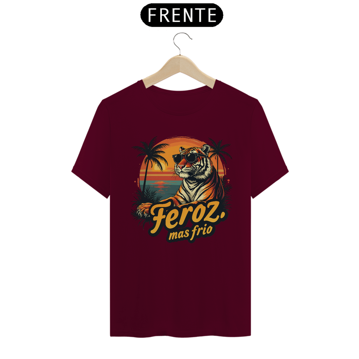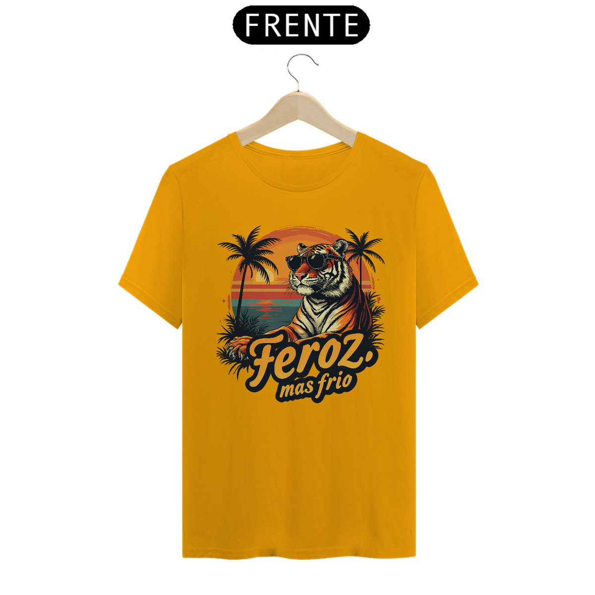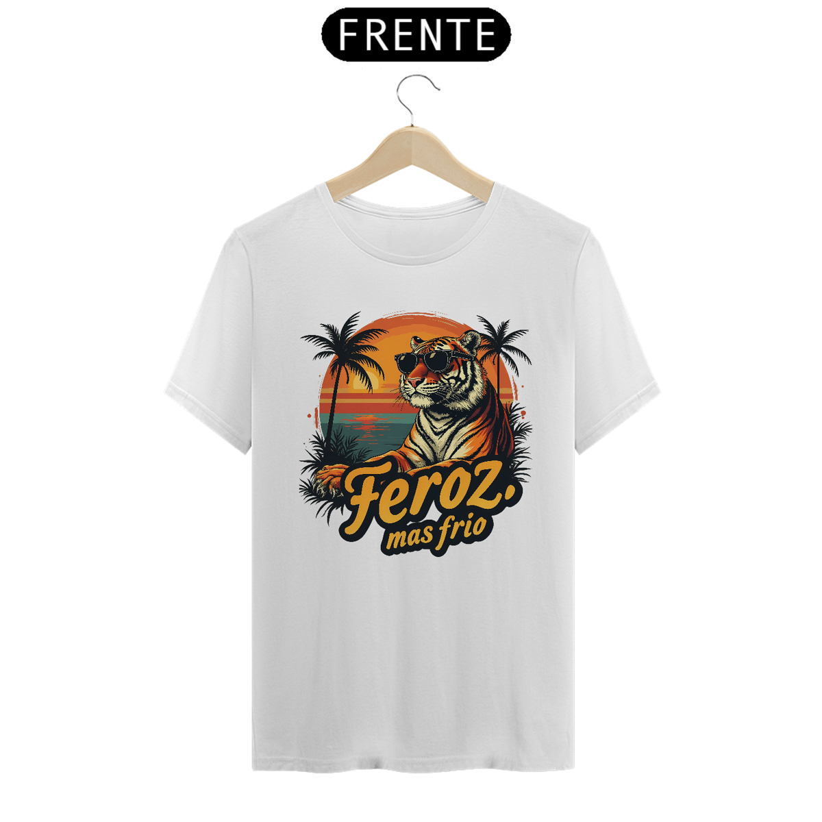Explore o equilíbrio perfeito entre atitude e estilo com a Camiseta Tigre Estiloso, uma peça única que une a ferocidade de um tigre com o ar descontraído dos óculos escuros. A arte apresenta um impressionante pôr do sol em tons de laranja, emoldurado por palmeiras em preto, destacando a frase marcante: "Feroz, mas frio!".